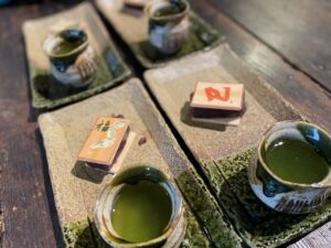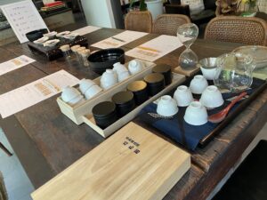 始めに何種類かのお茶を試飲して、そのあと順番に注がれるお茶を‘飲んで、香りを嗅いで、色を見て’、どのお茶か当てるというもの。